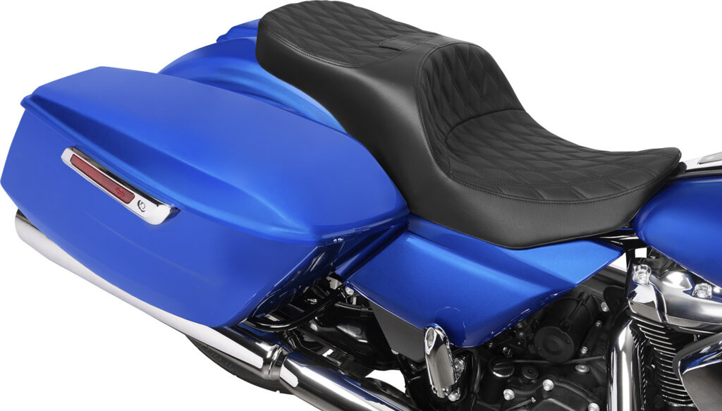 The new Freedom touring seat from Drag Specialties features a 5 and ¾-inch tall driver support with unique styling and is covered in automotive-grade vinyl. The seating area is contoured for maximum comfort and features a narrow design up front for improved leg clearance. This seat also works with Drag’s EZ Glide frame-mounted receiver mechanism to accept EZ Glide backrests. It will also work with Harley-Davidson and OEM frame-mounted backrest mechanisms and backrest pads. Available in double diamond stitch with black, silver, or red thread for 24-25 FLHX/FLHXU/FLTRX/FLTRXSTSE and 23-25 FLHXSE/FLTRXSE models. All mounting hardware is included. MSRP: $525.95.