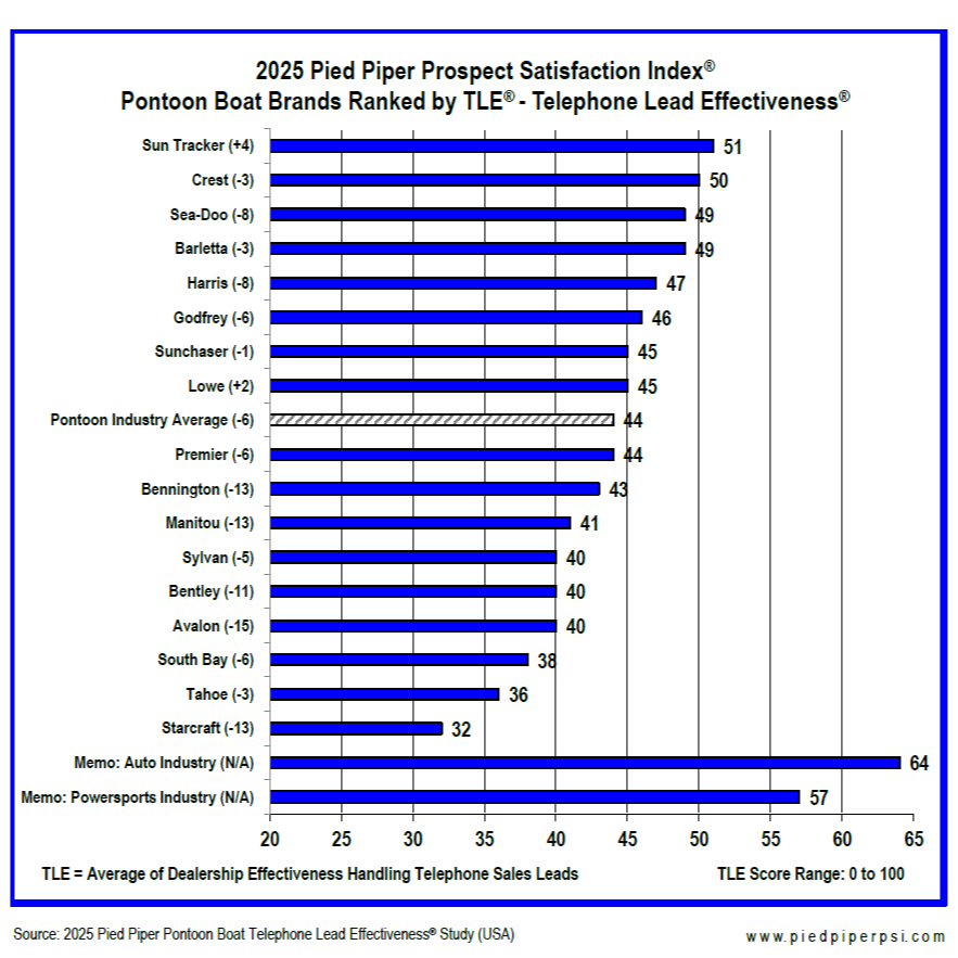 Bass Pro Shops’ Sun Tracker dealers ranked highest in the 2025 Pied Piper PSI Telephone Lead Effectiveness (TLE) study, which measured how effectively dealers handled sales calls from customers interested in purchasing a pontoon boat.