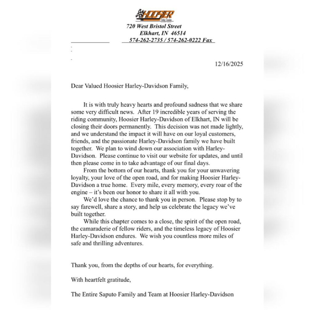 Hoosier Harley-Davidson in Elkhart, Indiana, has announced it will permanently close after 19 years serving the local riding community. The dealership recently posted on its Facebook page that the official closing date will be January 15, 2026.