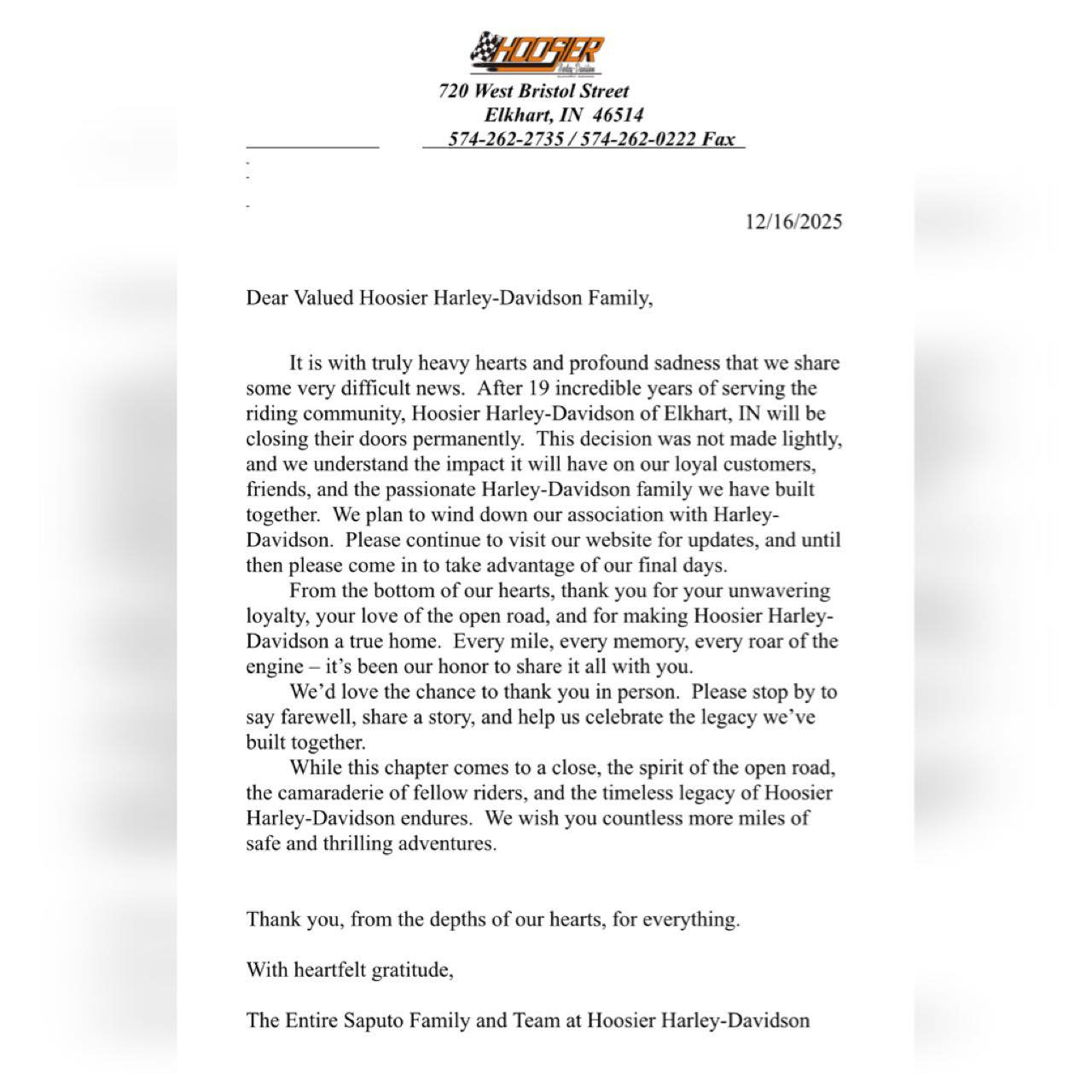 Hoosier Harley-Davidson thanked the community for its loyalty and support and said it remains committed to honoring its customers through the transition.