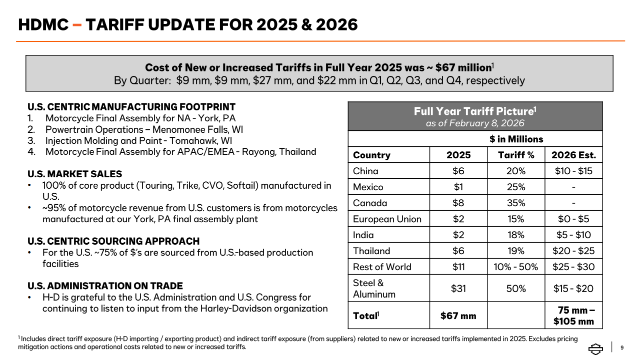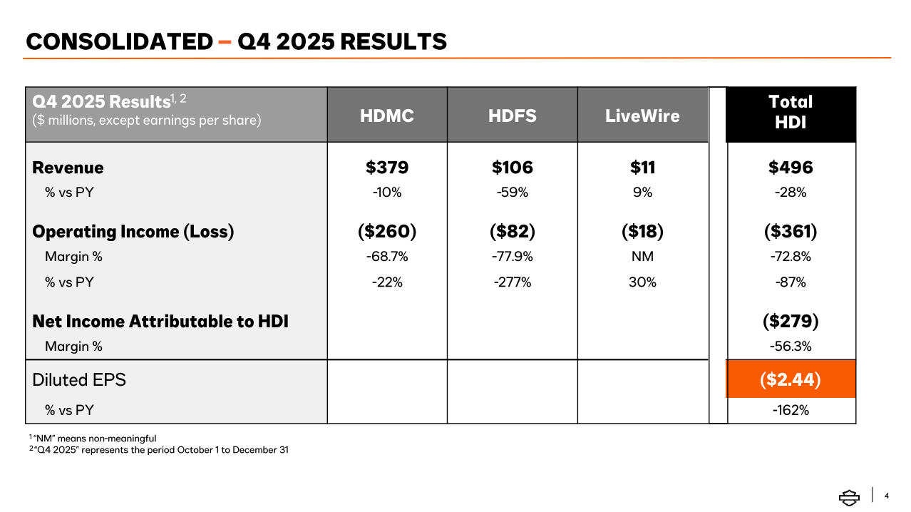 HDMC posted a full-year operating loss of $29 million, compared to operating income of $278 million in 2024. Gross margin declined 3.8 percentage points in 2025, pressured by lower volumes, incentive spend and tariffs.