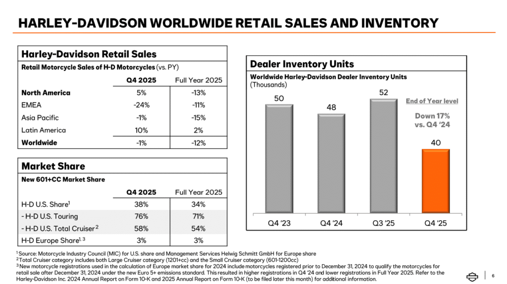 Notably for dealers, global dealer inventory of new motorcycles ended the year down 17% versus the end of Q4 2024, reflecting the company’s push to better match wholesale shipments with retail demand.