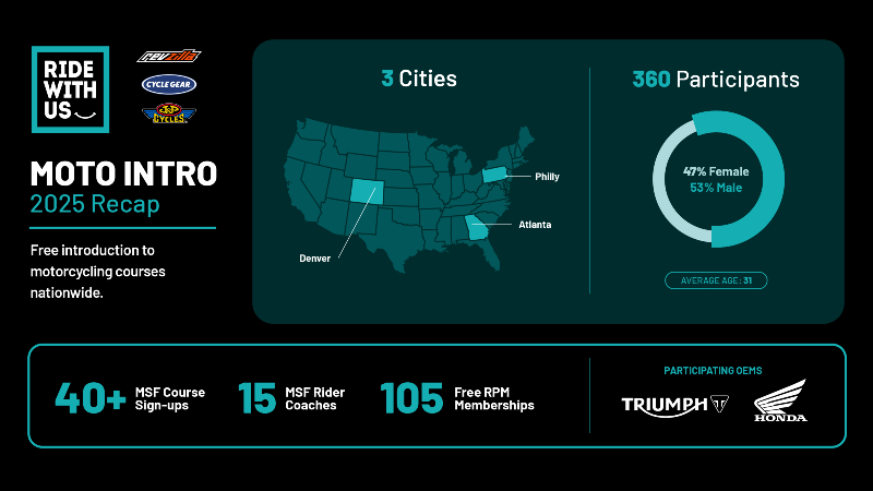 In partnership with the Motorcycle Industry Council’s Ride With Us initiative, the program introduced 360 first-time participants to motorcycling across events in Philadelphia, Denver, and Atlanta. Hosted at two Cycle Gear stores and one RevZilla location, the Moto Intro events offered controlled first-ride experiences using motorcycles supplied by Triumph and Honda, with instruction from MSF-certified coaches.