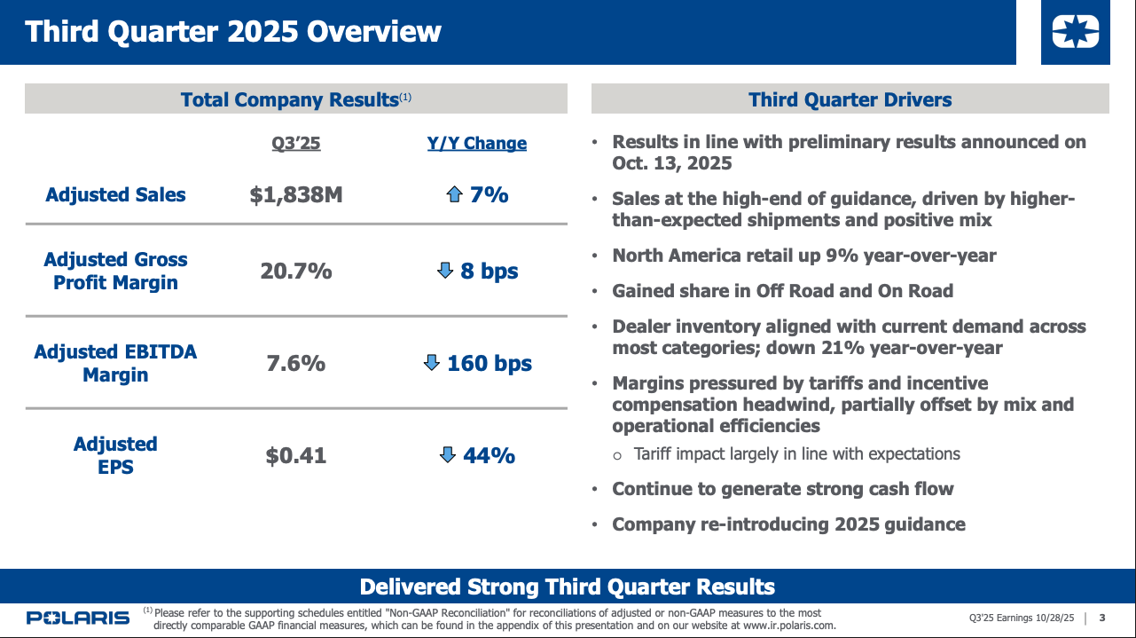 Polaris Inc. reported third-quarter 2025 sales of $1.84 billion, up 7% from a year ago, driven by strong off-road vehicle (ORV) performance, a favorable mix of higher-value models, and improved retail demand.