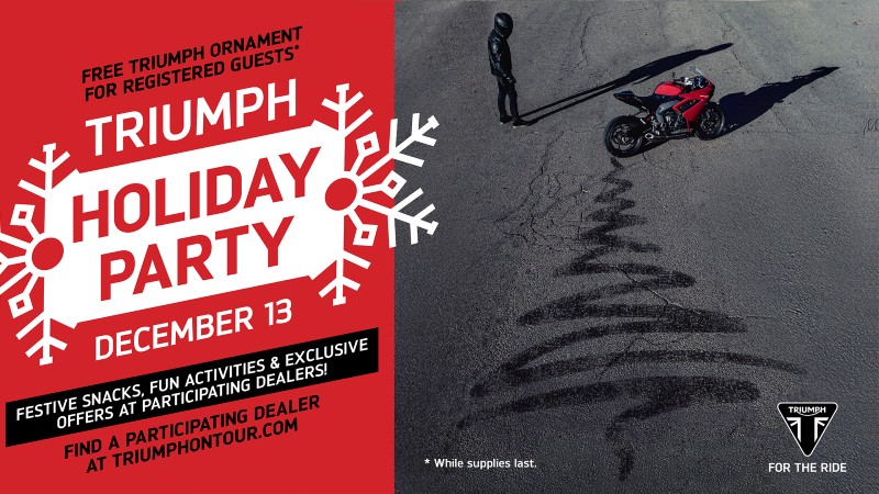 Visit the Triumph on Tour website for more information and to find participating dealers. Call your local dealer to find out what activities are scheduled for their Triumph National Dealership Holiday Party.