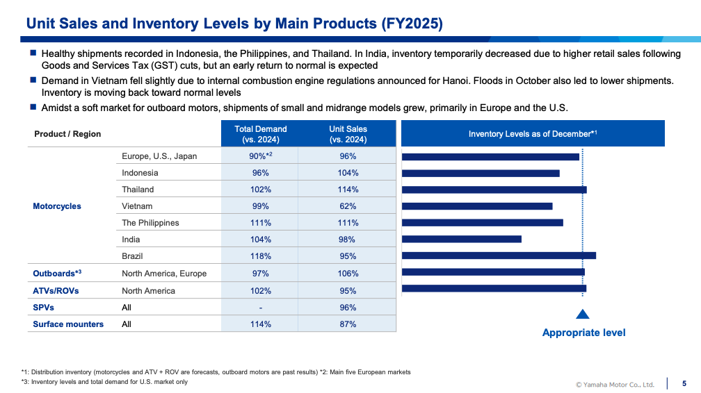 Demand for outboard motors in the U.S. — Yamaha’s primary market — remained roughly in line with the prior year. However, personal watercraft demand declined in the U.S., contributing to lower overall marine revenue and profitability.