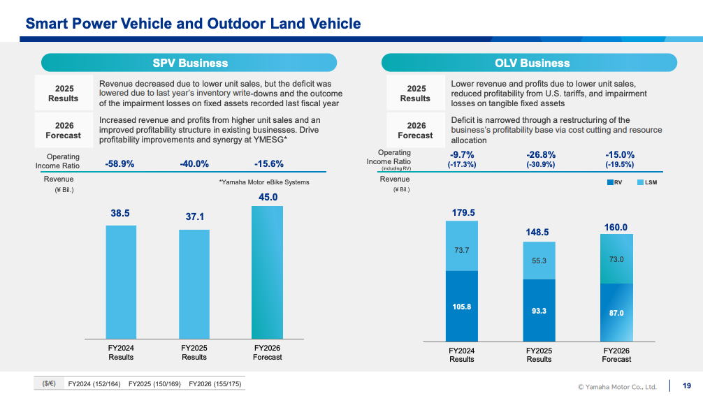 Yamaha Motor’s President and CEO Motofumi Shitara cited continued global uncertainty, including U.S. tariff policy and foreign exchange fluctuations, as key headwinds. Higher procurement costs, increased R&D and SG&A spending, and impairment losses in the company’s Outdoor Land Vehicle (OLV), i.e., ORV, business further pressured margins.