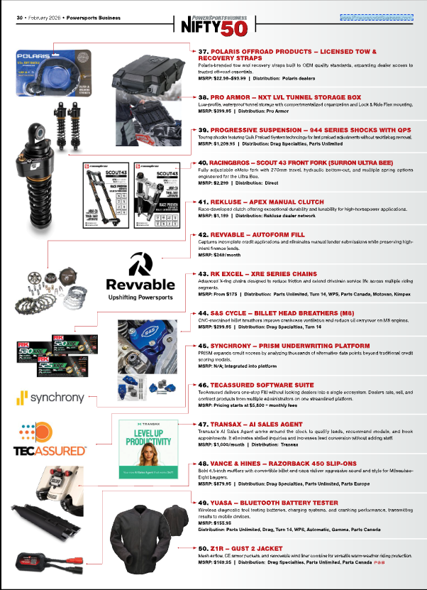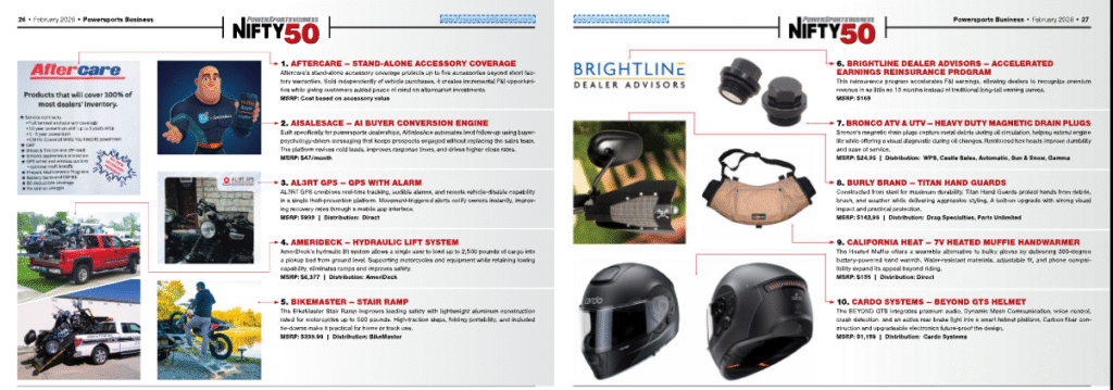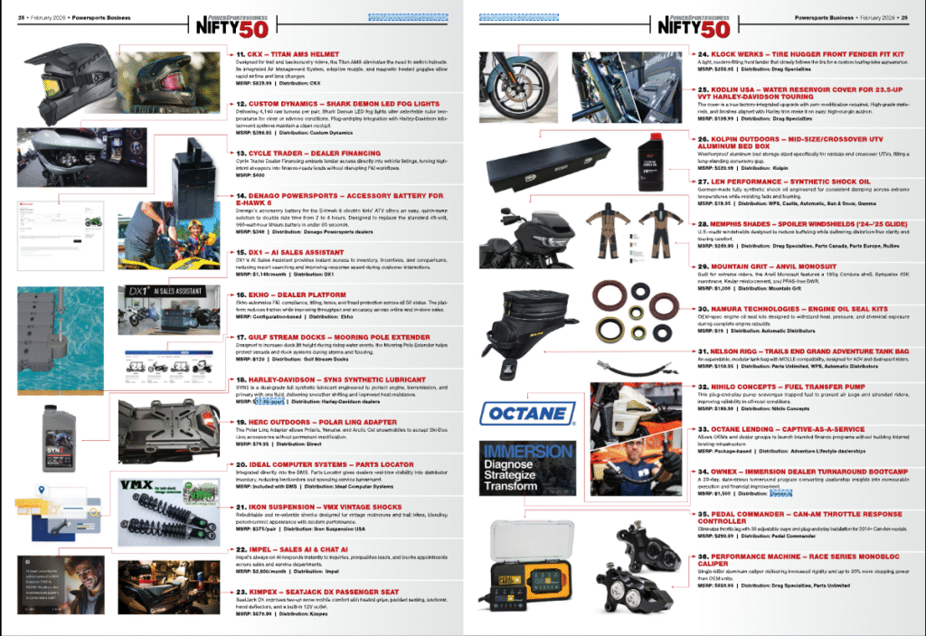 The Nifty 50 has long been one of the most closely watched product recognition programs in the powersports industry. Presented annually by Powersports Business, the Nifty 50 highlights 50 products and services that stand out for innovation, dealer impact and revenue potential across parts, accessories, apparel, technology and F&I.