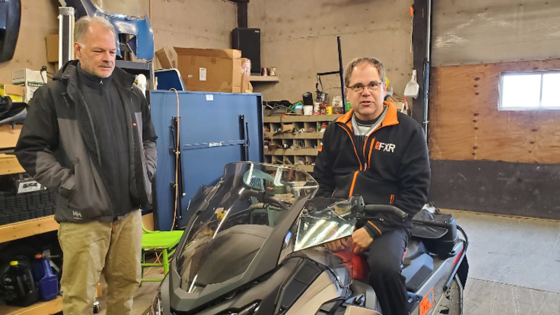 Prusak is seen here giving PSB and OPE editors a run-through of the snowmobile controls before a group ride in 2023. Neither Glenn Hansen (left) nor Brendan Baker had ridden a snowmobile at this point. But thanks to Prusak’s tutelage, we didn’t break anything. (Photo: Brendan Baker)