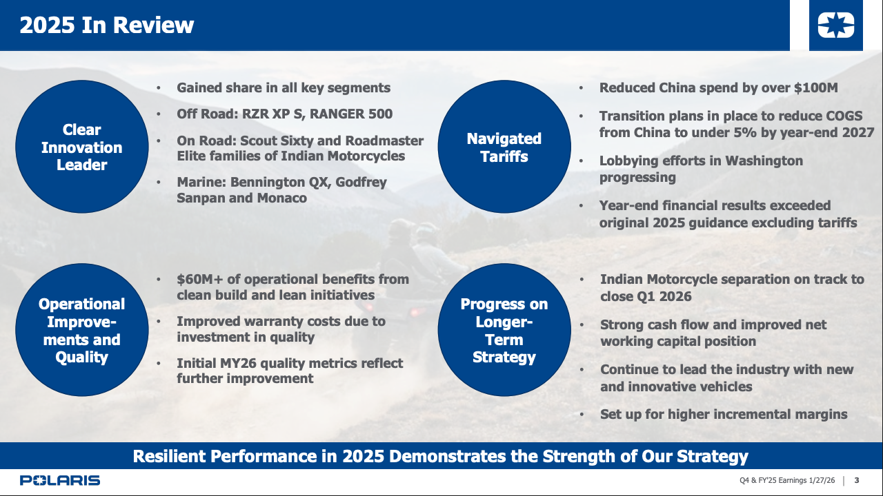 Tariffs weighed heavily on results, pressuring gross margin by $37 million in the fourth quarter alone. Still, Polaris delivered more than $60 million in operational savings in 2025 through manufacturing transformation initiatives and reduced warranty expense by $25 million due to quality improvements.