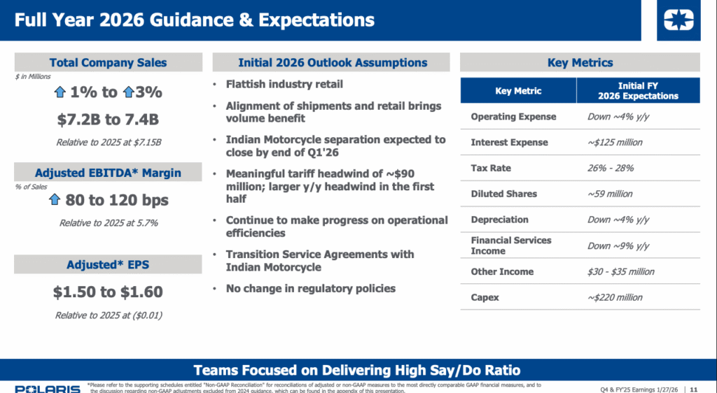 For 2026, Polaris forecasts sales growth of 1% to 3% and adjusted earnings per share of $1.50 to $1.60, assuming no material changes to current tariff policies. Excluding Indian Motorcycle, the company said the outlook equates to 7% to 9% organic growth.