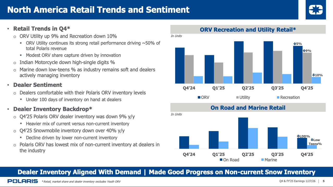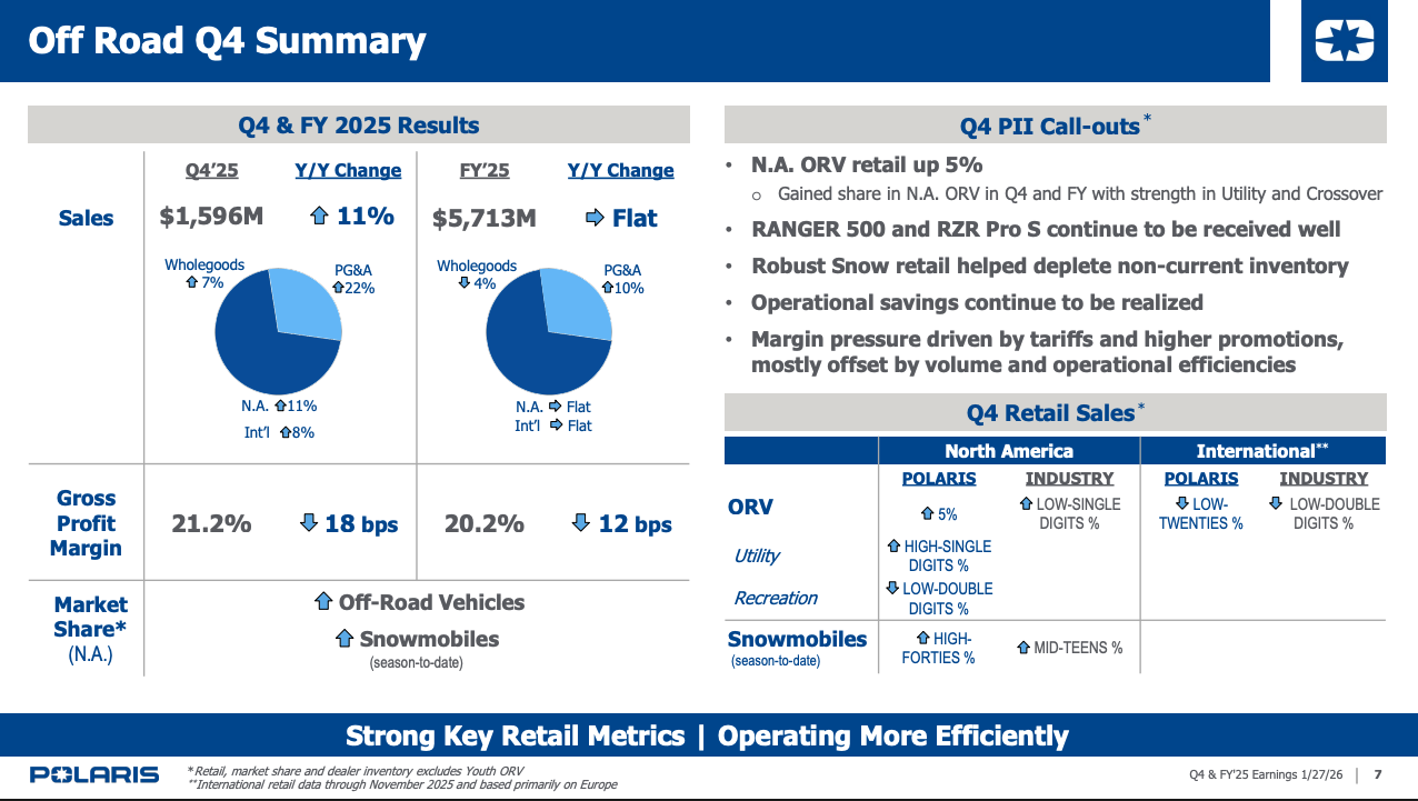 North American retail sales rose 9% in the fourth quarter, excluding Youth products, a metric Polaris emphasized as a clearer indicator of business health and profitability. The company gained market share across all major segments for the full year and reported share gains in ORV, snow and marine during the fourth quarter.
