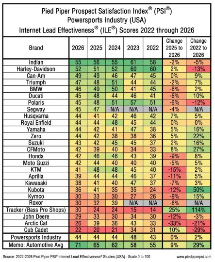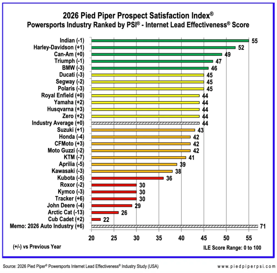 According to the 2026 Internet Lead Effectiveness (ILE) study from Pied Piper, Indian dealers earned the highest average score at 55, marking the fourth consecutive year the brand has led the rankings. Top performers behind Indian included Harley-Davidson, Can-Am, Triumph and BMW Motorrad.